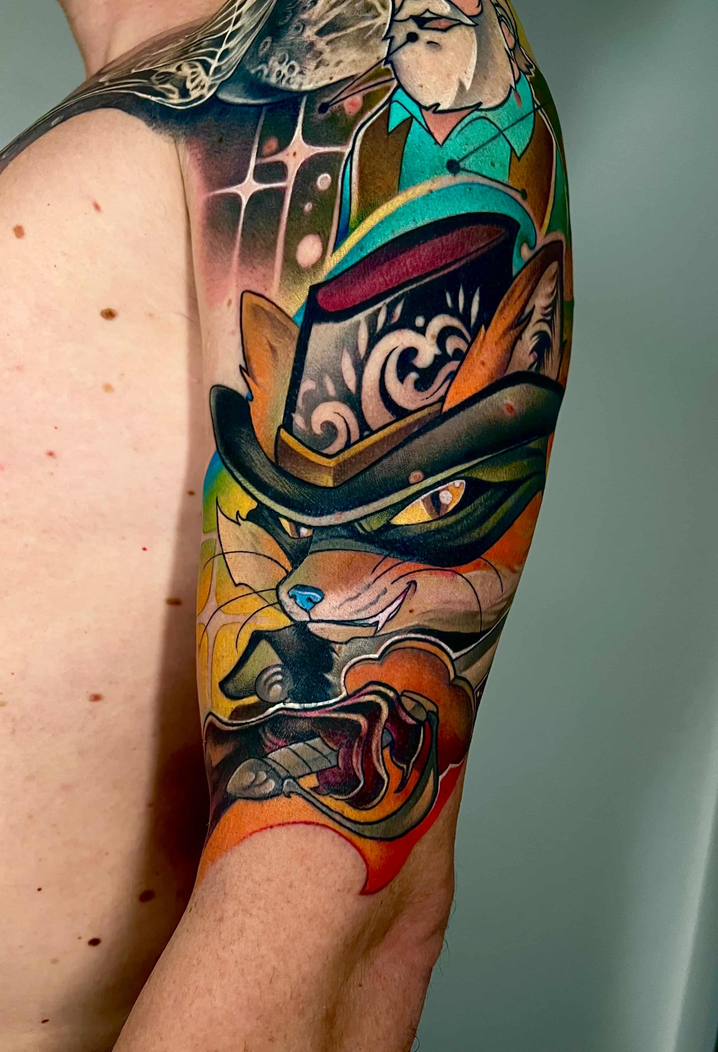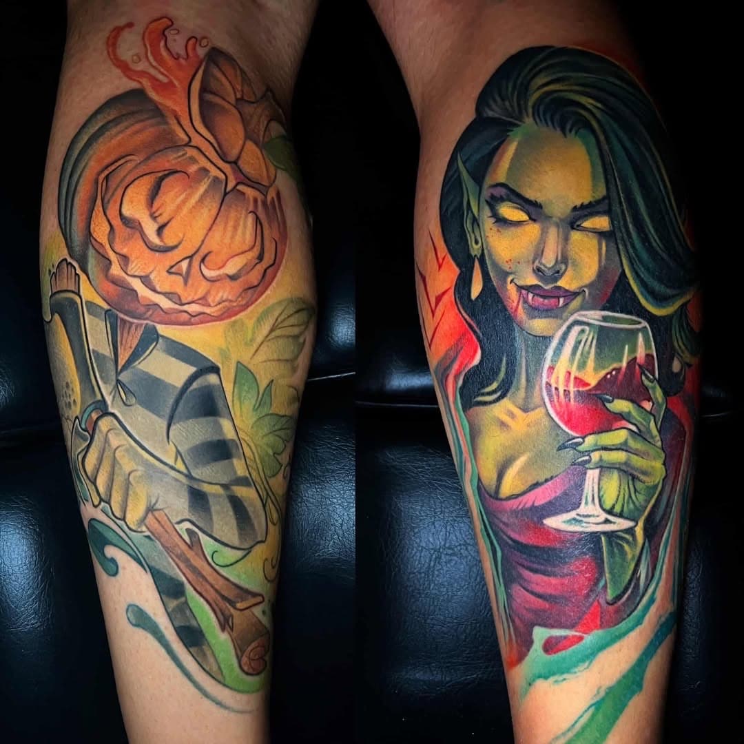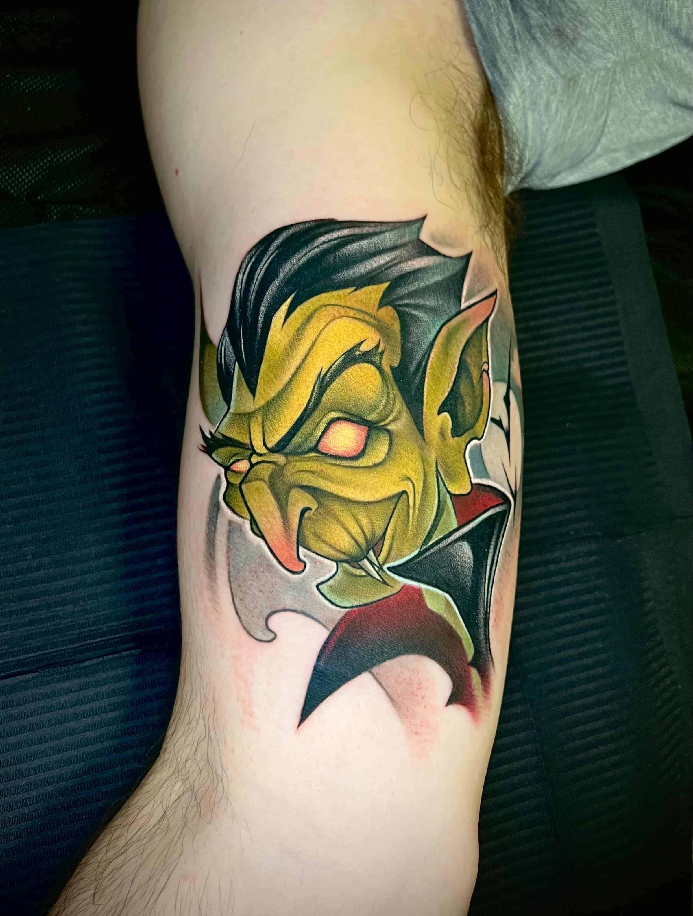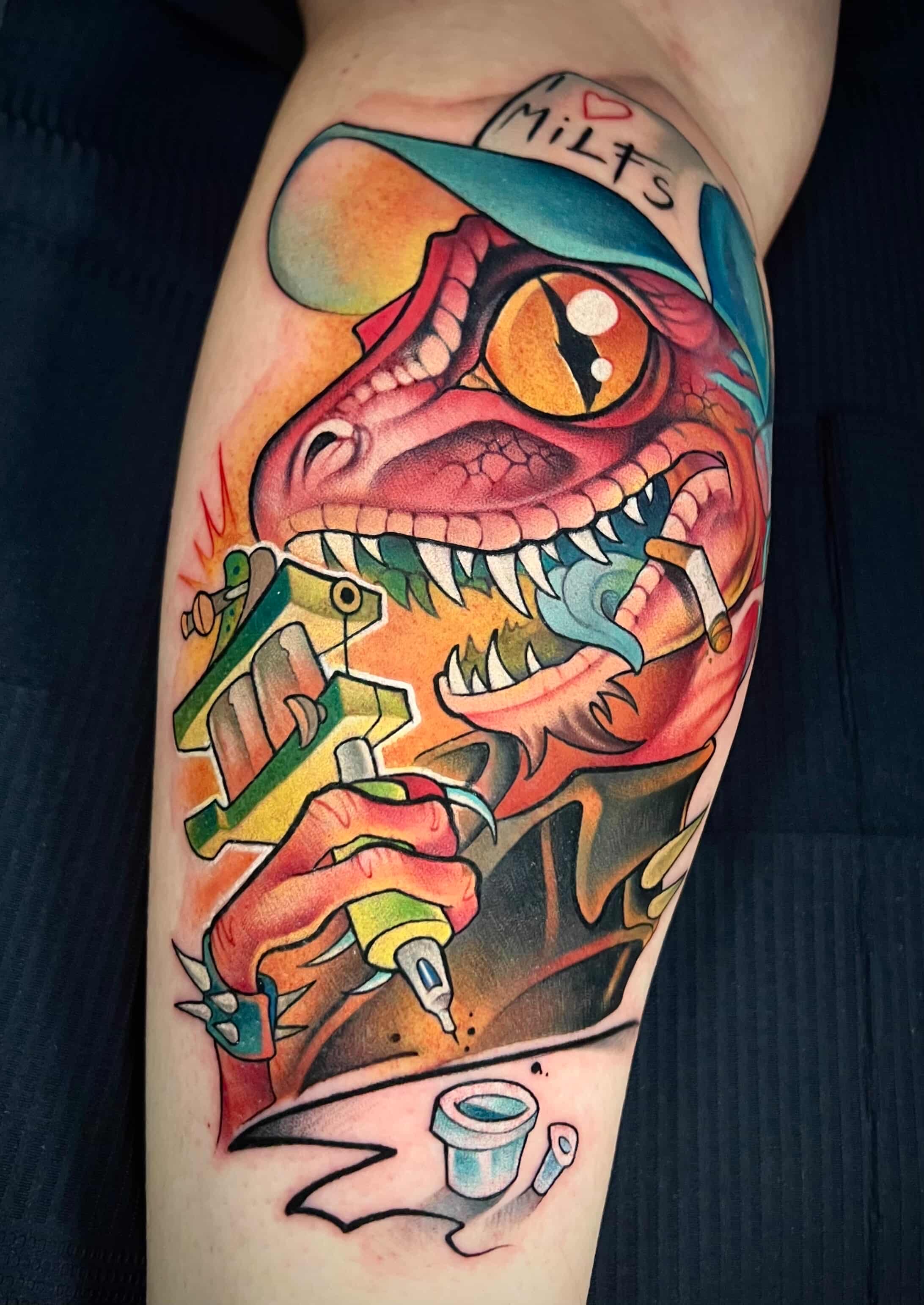 Tattooing professionally since the mid-2010s, he has refined a style defined by saturated palettes, exaggerated forms, clean structure, and strong contrast. His work balances playful distortion with solid fundamentals, resulting in tattoos that feel dynamic while maintaining long-term clarity and durability in the skin.